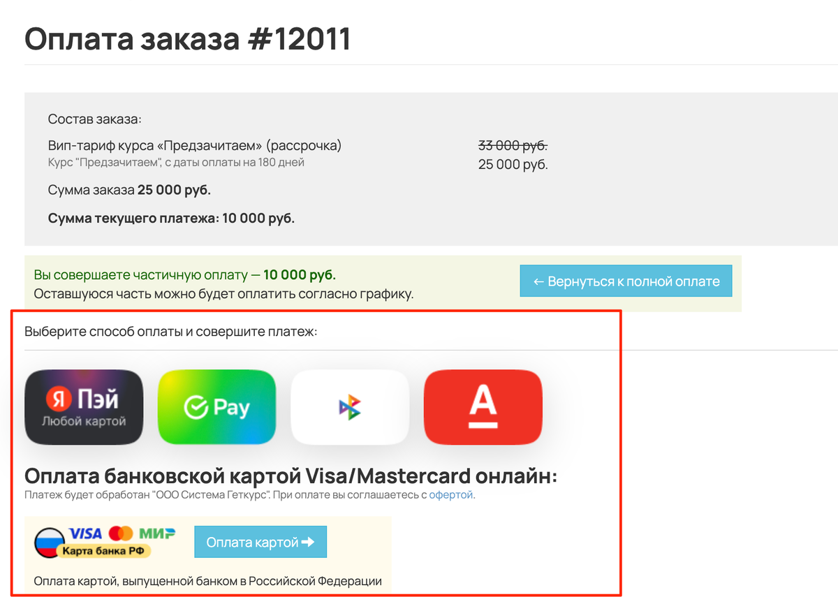 Напоминание об оплате придет за пять дней до даты внесения. Полностью оплатить курс можно в любой момент (для этого напишите в техподдержку).